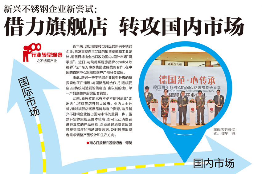 新興不銹鋼企業(yè)新嘗試:借力旗艦店 轉(zhuǎn)攻國內(nèi)市場近年來,迫切需要轉(zhuǎn)型升級(jí)的新興不銹鋼企業(yè),愈發(fā)重視自主品牌的銷售渠道和工業(yè)設(shè)計(jì),銷售目標(biāo)由全出口改為國內(nèi)、國外市場“兩手抓”。近日,與純德系廚房品牌othello(歐德羅)與廣東萬事泰集團(tuán)達(dá)成戰(zhàn)略合作,在中國的首家中心旗艦店落戶廣州馬會(huì)家居。由此,新興一些不銹鋼企業(yè)轉(zhuǎn)型升級(jí)的新探索也正在鋪展:與國際品牌合作、引進(jìn)旗艦店,由傳統(tǒng)制造到智能制造,由以前的出…
