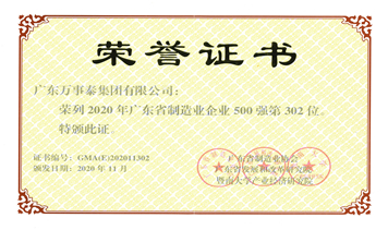 「喜訊」萬事泰集團榮列2020年廣東省制造業企業500強推薦