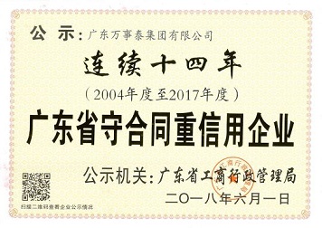 「喜訊」萬事泰連續十四年榮獲“廣東省守合同重信用企業”稱號推薦