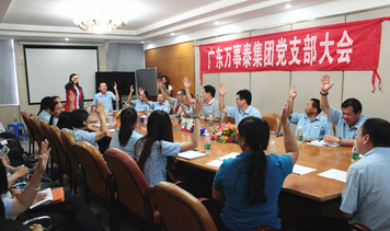集團訊 10月7日下午5時許,萬事泰黨支部在集團一樓會議室召開廣東萬事泰集團黨支部大會,集團全體黨員參加了會議。會議由黨支部書記陳永錦和黨支部副書記、工會主席梁洪光共同主持。會上,梁洪光作會議主持人講話,闡明了這次黨支部大會議程分為三項:第一、討論表決梁中興等六位同志按期轉為正式共產黨員;第二、討論表決鄧偉良等七位同志吸收為預備黨員;第三、討論確定廖巧玲等六位同志為發展黨員對象。會中,各預備黨員、…