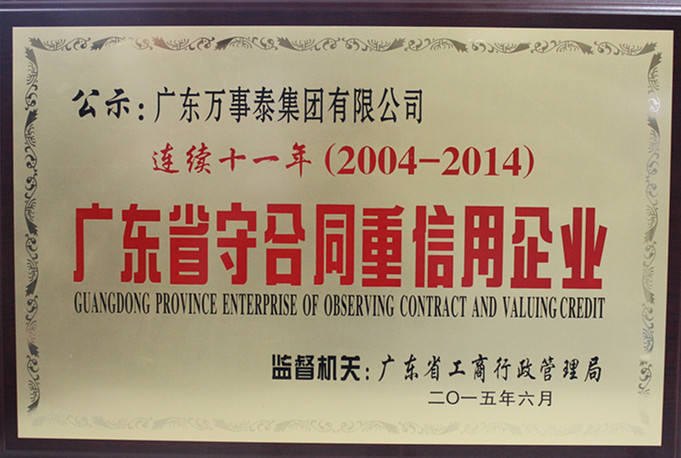誠信在心,方能鑄就一流百年企業(yè)2015年12月10日 ,以萬事泰集團(tuán)為首的46家企業(yè),在新興縣工商局隆重接過了2014年度“廣東省守合同重信用企業(yè)”的榮譽(yù)牌匾。這是秉承“誠信在心,方能鑄就一流百年企業(yè)”的萬事泰集團(tuán)連續(xù)11年獲得該榮譽(yù)稱號。當(dāng)天授匾儀式上,新興縣工商局局長陳小紅系統(tǒng)總結(jié)了2014年度“廣東省守合同重信用企業(yè)”公示工作的總體情況。據(jù)其介紹,今年全縣共有49家企業(yè)公示為“廣…