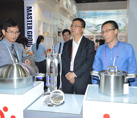 本屆交易會推出的“MASTER AI COOKING”(智能廚具)受到各國客商的晴睞。云浮市副市長胡海運在百忙中專程到集團展位視察和了解集團在廣交會的展覽情況。并鼓勵集團領導必須要搞科技創新、產品轉型升級,打造自己的品牌戰略。國家輕工商會會長王忠奇也親臨集團展位視察,集團董事長梁桂泉、副總裁劉炳耀接待陪同他們參觀了展位新產品。