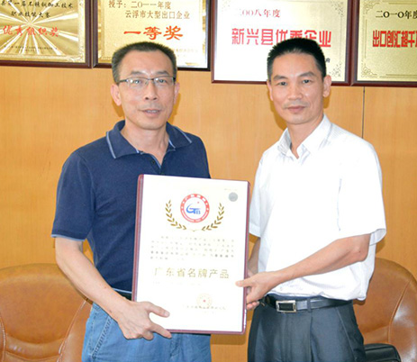 7月31日,新興縣質監局局長黎華楷等領導來到萬事泰一樓會議室,為萬事泰頒發“廣東省名牌產品”證書,并與萬事泰常務副總裁劉炳耀、行政部經理陳永錦進行了座談會。座談會,雙方針對創建名牌產品等問題進行了探討。