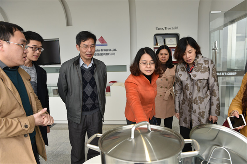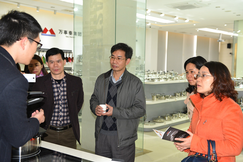 陳金德主任調(diào)研組一行首先參觀萬事泰智能廚房展廳,調(diào)研組對萬事泰智能廚房非常感興趣,智能廚房產(chǎn)品上傳感器的應用、工藝技術的創(chuàng)新、產(chǎn)品的設計理念,都一一得到調(diào)研組的高度贊揚。調(diào)研組了解萬事泰的新產(chǎn)品研發(fā)方向、理念以及車間自動化生產(chǎn)情況。調(diào)研組介紹了促進中心的總體情況和服務功能,并對高企認定(培育)、工業(yè)設計等內(nèi)容進行宣講,旨在將中心優(yōu)勢科技資源與專業(yè)鎮(zhèn)服務需求進行有效對接,為專業(yè)鎮(zhèn)及廣大中小微企業(yè)服務,推動專業(yè)鎮(zhèn)轉(zhuǎn)型升級。