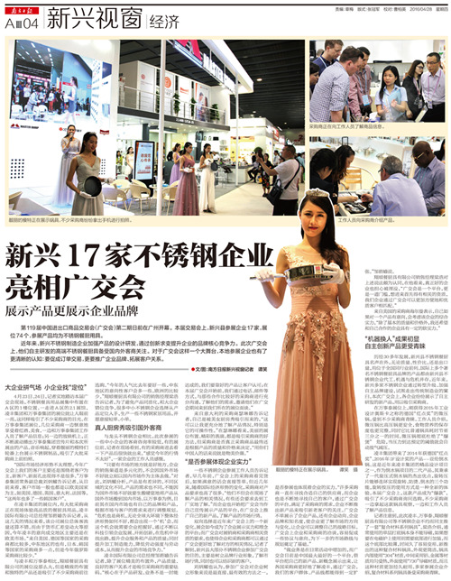 雙向選擇是近年來(lái)廣交會(huì)上的一個(gè)新變化。展會(huì)如今成為了企業(yè)展示實(shí)力和理念的平臺(tái);而廣交會(huì)對(duì)展銷商和采購(gòu)商相關(guān)資質(zhì)的要求,也使得企業(yè)和采購(gòu)商都可以通過(guò)廣交會(huì)更好地了解對(duì)方的相關(guān)情況。記者了解到,新興縣大部分不銹鋼企業(yè)參加廣交會(huì)的目的,主要是樹立品牌行業(yè)形象,了解市場(chǎng)行情,同時(shí)也可以結(jié)識(shí)新的客戶。