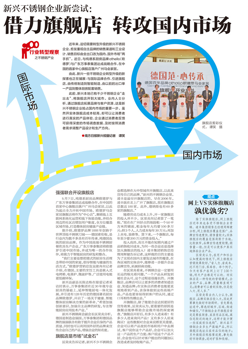 近年來,迫切需要轉型升級的新興不銹鋼企業,愈發重視自主品牌的銷售渠道和工業設計,銷售目標由全出口改為國內、國外市場“兩手抓”。近日,與純德系廚房品牌othello(歐德羅)與廣東萬事泰集團達成戰略合作,在中國的首家中心旗艦店落戶廣州馬會家居。