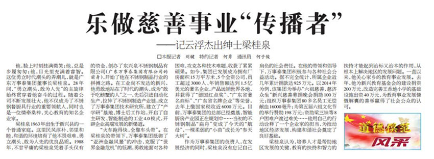 梁桂泉1963年出生于新興縣的一個普通家庭。這里民風淳樸、鄰里和睦,和諧的環境培育了他不畏艱難、勇立潮頭、敢為人先的優良品質。1988年,不甘平庸的梁桂泉憑著手頭僅有的資金,創辦了東興泉不銹鋼制品有限公司(廣東萬事泰集團有限公司的前身),開始了他在不銹鋼制品行業的拼搏之路。在工業尚不發達的新興,他勇敢地站在了時代的潮頭,成為“敢于吃螃蟹的人”之一,先后引進自動化生產,拉伸了不銹鋼制造產業鏈,成立了萬事泰集團技術研究所,建立了“產學研”基地、博士后工作站,開啟了自主研發、智能制造的工業4.0模式,開辟企業高端發展的新渠道。