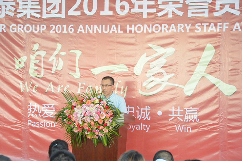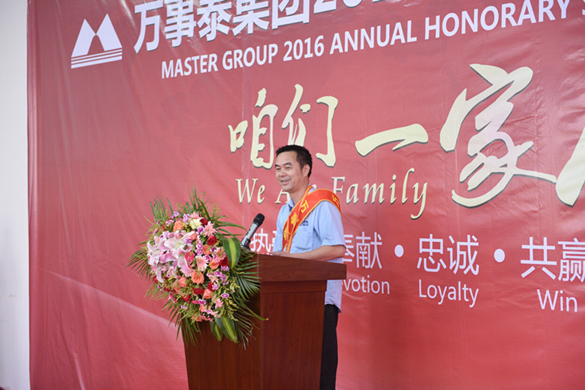 當(dāng)天下午4點30分,頒獎典禮緩緩拉開序幕。執(zhí)行總裁劉總致辭,他說道:這是集團(tuán)家人們一年一度的團(tuán)聚,讓我們在拼搏的日子里不忘初心,坐下來聊聊,過去的成長與收獲,從而再次精神飽滿地出發(fā)。萬事泰集團(tuán)從成立、發(fā)展壯大至今,二十余年風(fēng)雨兼程,在座的各位榮譽員工,是萬事泰成就輝煌的參與者、見證者,集團(tuán)的每一個成就、每一次突破,都凝結(jié)著你們的青春、智慧和汗水。集團(tuán)奉行“以人為本”,堅持人才戰(zhàn)略,每一位把青春、智慧和忠誠奉獻(xiàn)給萬事泰的榮譽員工,都是集團(tuán)最寶貴的財富。你們多年始終如一、矢志不渝,勤奮、拼搏、務(wù)實、忠誠、細(xì)心等優(yōu)秀可貴的品質(zhì),就是對“工匠精神”的完美詮釋。萬事泰因為有你們添磚加瓦而越加精彩卓越,我希望各位榮譽員工能在各自的崗位上守土有責(zé),做好楷模表率,影響帶動年輕人,傳承發(fā)展“萬事泰精神”,與集團(tuán)一同譜寫新的篇章。