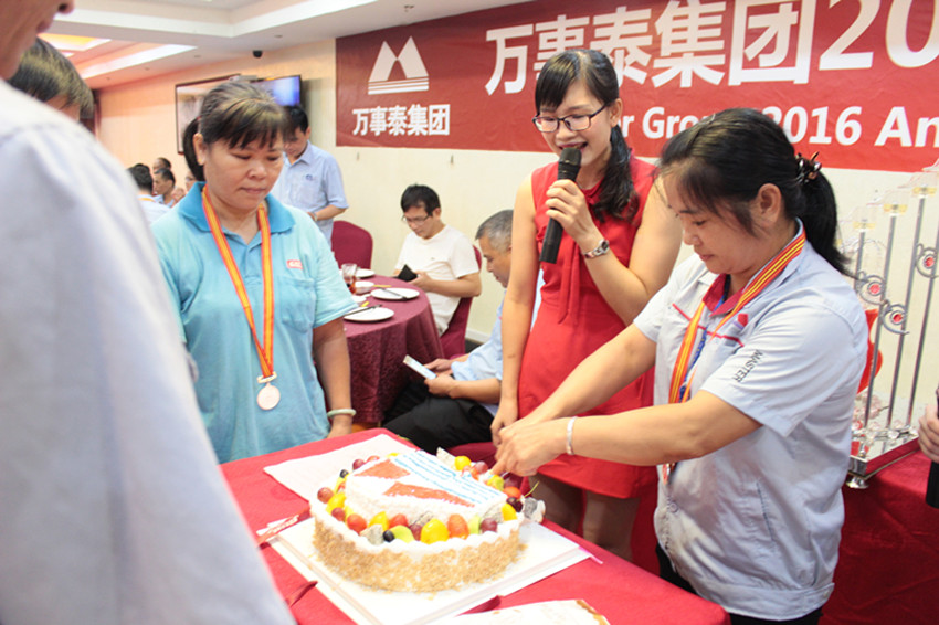 晚宴開始前,最特殊溫情的環(huán)節(jié)出現(xiàn)了!集團(tuán)為8月生日的新晉榮譽員工慶賀生日,四位當(dāng)月過生日的老員工十分驚喜,在現(xiàn)場感動得眼眶濕潤。一位員工表示,這是她度過最特別最難忘的一個生日,在萬事泰工作了十多年,心里很溫暖,家的溫暖,親人的溫暖,是支持她在這里扎根的重要原因。