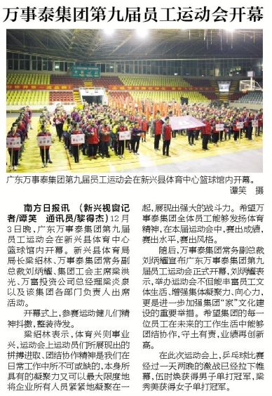 南方日報訊(新興視窗記者/譚笑 通訊員/黎德杰)12月3日晚,廣東萬事泰集團第九屆員工運動會在新興縣體育中心籃球館內開幕。新興體育局局長梁紹林、萬事泰集團常務副總裁劉炳耀、集團工會主席梁洪光、萬富投資公司總經理梁炎泉以及該集團各部門負責人出席活動。