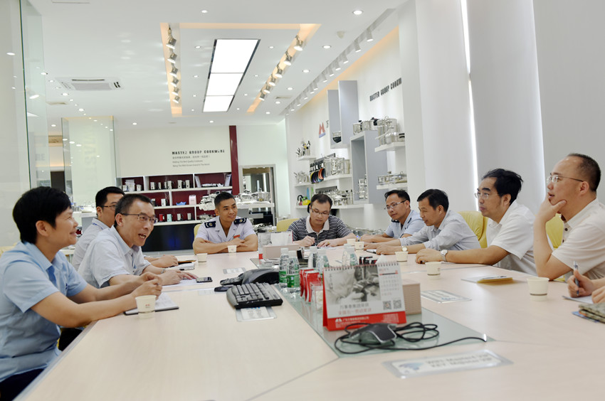 調研團一行先后來到全景廠區沙盤模型、四樓智能餐廚具產品展示廳,劉總向大家介紹了榮獲德國紅點獎的智能微壓鍋、廣交會上備受關注的智能健康大廚房等系列產品。調研團對萬事泰集團近年來在轉型升級的道路上收獲到的累累碩果表示贊嘆不已。