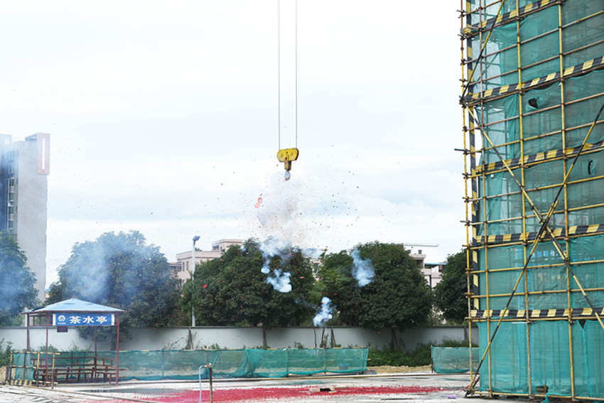 伴隨著震耳欲聾的鞭炮聲,封頂正式落地完成。