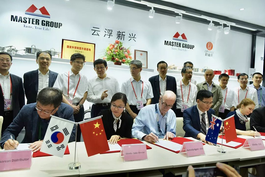 在陳德銘部長和黃書記調研過程中,適逢萬事泰集團分別與俄羅斯、澳大利亞、韓國、以色列四家客商在廣交會上達成othello(歐德羅)品牌代理與貿易協議并現場進行簽約,陳德銘部長和黃書記等一行領導共同見證了雙方簽約儀式。