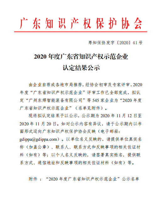 集團訊 日前,廣東知識產權保護協會公示了2020年度廣東省知識產權示范企業認定結果。憑借在技術創新和知識產權管理工作上的突出表現,廣東萬事泰集團被認定為“2020年度廣東省知識產權示范企業”。
