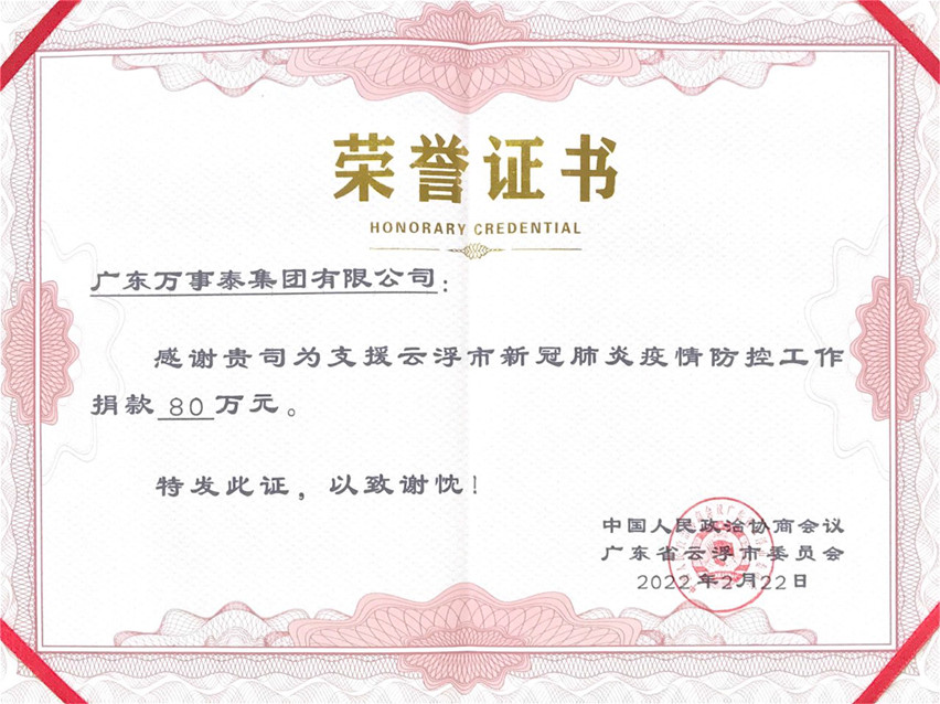 廣東萬事泰集團是市政協委員企業,在今年初共同面對突發輸入性新冠疫情防控中,積極參與市、縣共同抗疫,響應市政協的倡議,愛心捐資80萬元支援云浮市新冠肺炎疫情防控工作,用實際行動助力疫情防控,為打好打贏疫情防控殲滅戰貢獻企業力量。