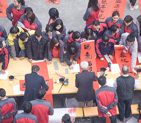 從上午10點鐘開始至下午13:30分,書法家們沒有片刻休息,水也沒有喝上一口,歷時三個多小時,現場揮毫潑墨,飽含激情為員工書寫了近五百多幅春聯。